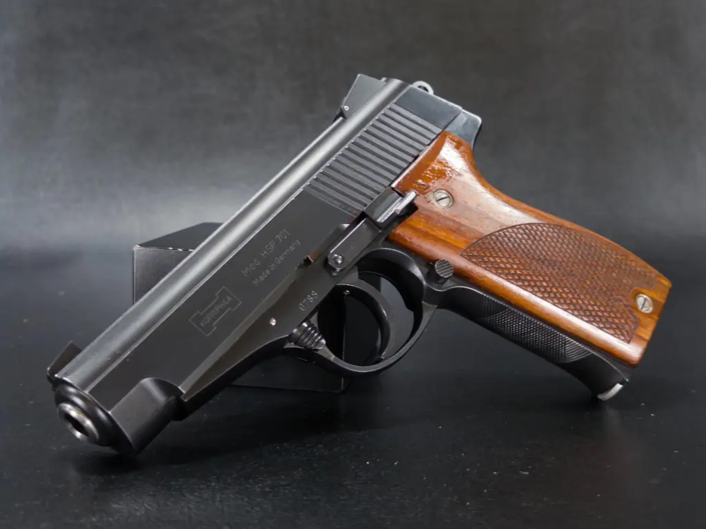 A bespoke masterpiece by Edgar Budischowsky, the Korriphila HSP‑701 is a handcrafted .45 ACP semi‑automatic pistol featuring a fixed barrel, roller‑delayed blowback mechanism, and minimalist external controls. Built to order with choices on barrel length, trigger type, caliber, and finish—including blued, silver, and Damascus options—each HSP‑701 is a precision-forged collector’s work, with fewer than 400 ever made.